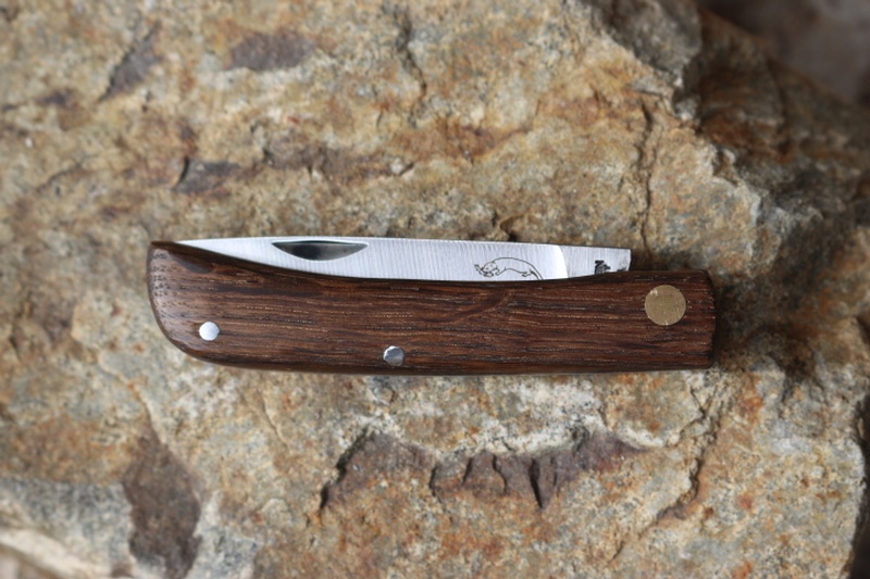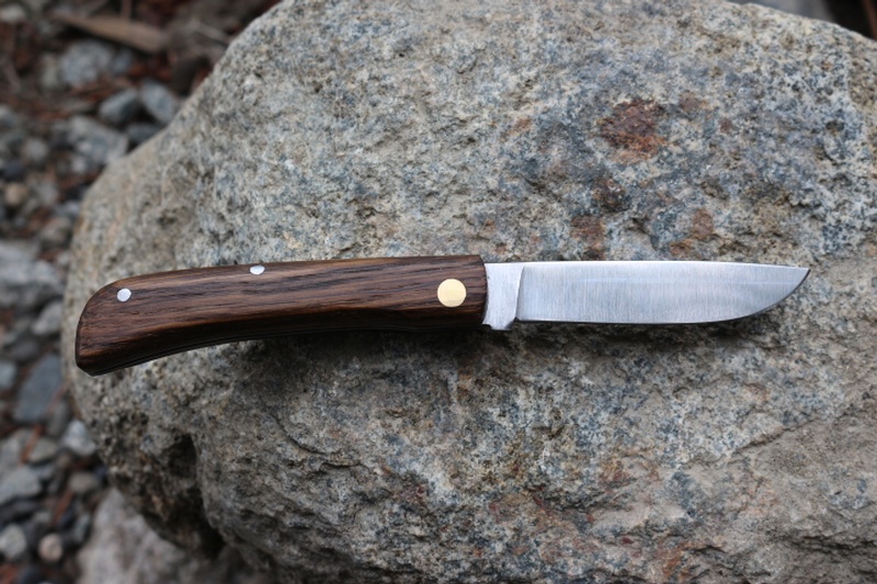 Smoked Oak handle slabs with a Heavy Brass pivot, Steel pins and liners and a simple, but reliable, Spring Steel design.