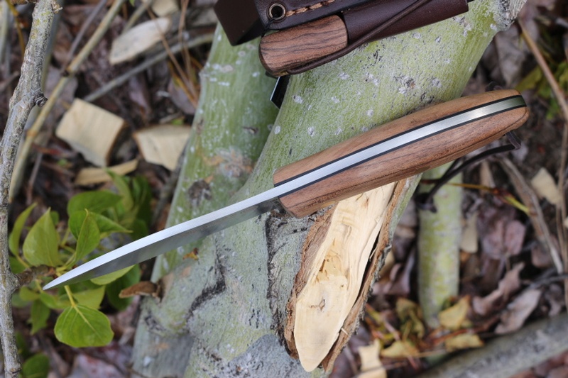 The mainframe is Full broad tang and the handle a Tear Drop Form, nestling the knife neatly in the hand. Two Pins and a lanyard hole are Brass and the Walnut Slabs have Black G10 liners.