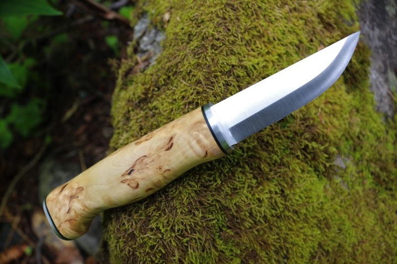 Made in the traditional way with a full narrow tang and full wrap around Curly Birch handle, the Grandfather also has a double Steel Caps with Black liners and a superb 3in spear Point Blade of the excellent Swedish 14C28N Stainless Steel. This is a tough, full stainless with excellent reputation for edge holding too.
