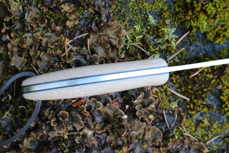 The mainframe is Full broad tang and the handle a Tear Drop Form, nestling the knife neatly in the hand. Two Pins and a lanyard hole are Steel and the Natural Canvas Slabs have Black G10 liners.