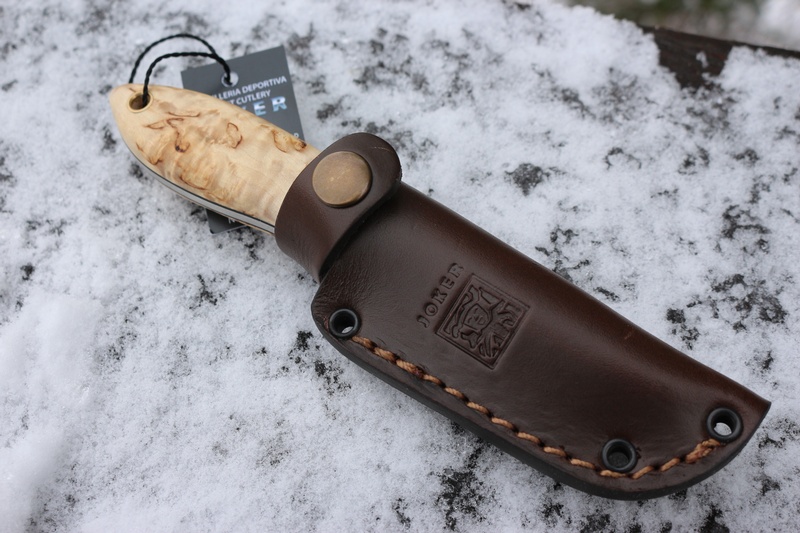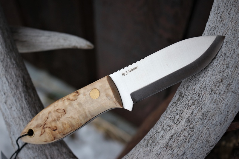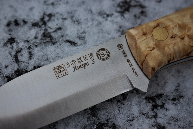 Birch Slabs with Brass Pins, the Steel is the excellent Swedish Sandvik 14C28N Stainless, scandi ground for ease of sharpening.