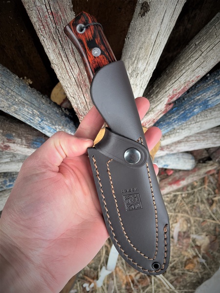 An extremely comfortable knife and a pleasure to use! It includes a nice leather sheath with good stitching and a belt loop.
