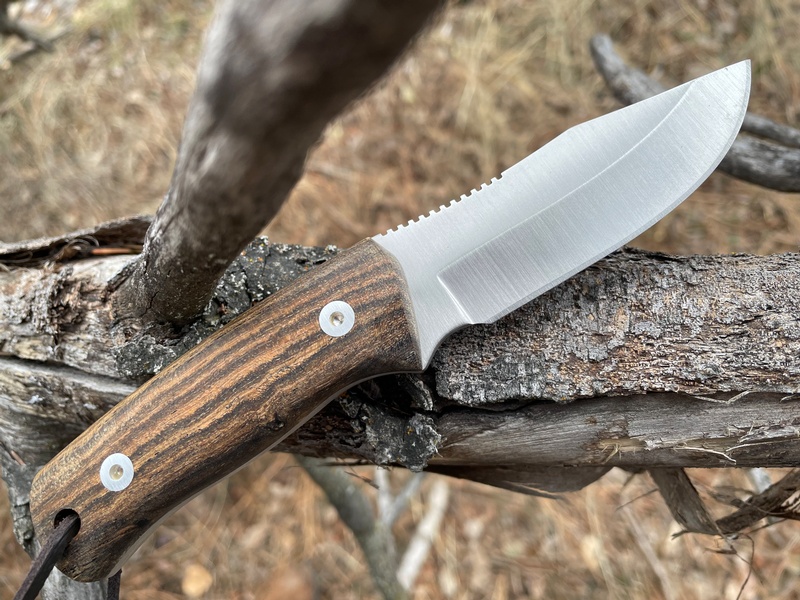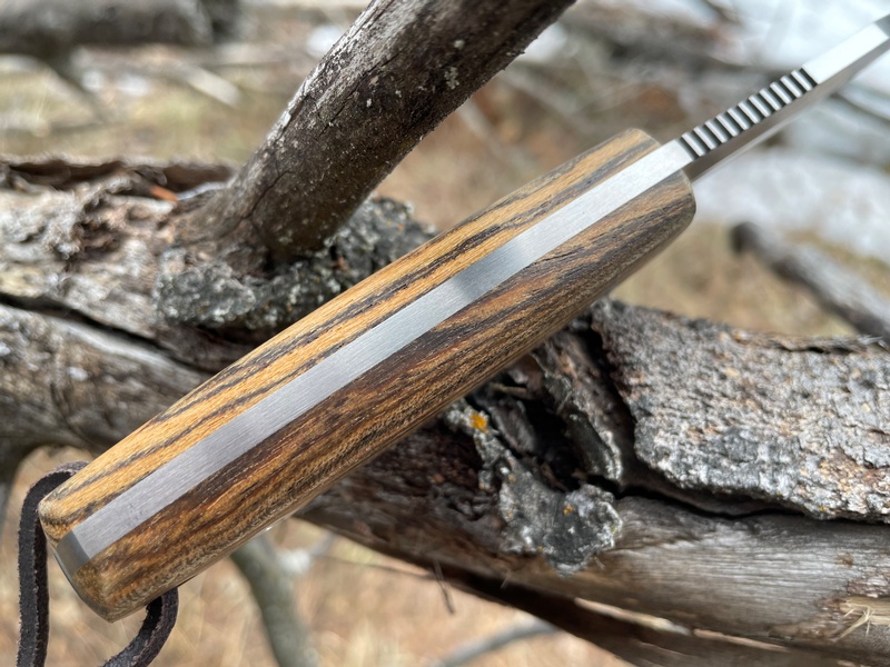 The knife is full broad tang giving it a very sturdy and solid feel, it also has a good amount of jimping on the blade which helps with thoes finer cuts! would make for the perfect Hiking companion! Despite its smaller size with small to medium hands you can get a full grip on the handle which makes it very usable. It comes with a leather sheath and lanyard.