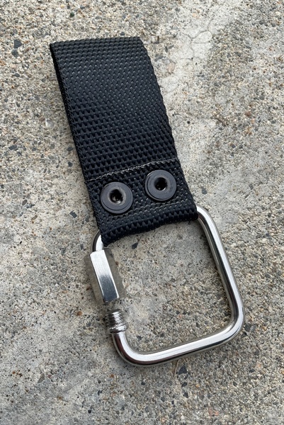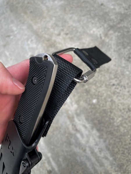 The extender EXT allows you to carry the knife lower on the belt, which simplifies the knife’s accessibility. When wearing a lot of clothes (like in winter), or wearing a long coat, or using a backpack with a hip belt, this gadget fits perfectly. Even when sitting in the car or on a stump, EXT makes it easier to control how the knife should end up. EXT is very strong, completely insensitive to water and made of rust-resistant materials – the rivets are in 304 steel and the 5 mm thick carabiner is in 316 steel. EXT as a whole holds 280 kg/615 lbs, while the carabiner itself holds 1300 kg/2860 lbs before it begins to deform
