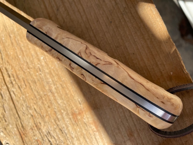 Overall length is just 8.5in, but the knife feels like a full sized Bush Knife and the strong Full Broad tang construction together with the solid pins and select Curly Birch slabs with liners add to the durability and 'Hand feel'.