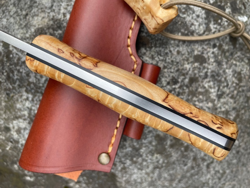 The 'Lars' is a great combination of beauty and utility, with its excellent Curly Birch Handle (Black liners) and clean lines it looks like its wanting a job to do, while the superb Scandi Ground Bohler Sleipner Steel, looks like it could do it!.