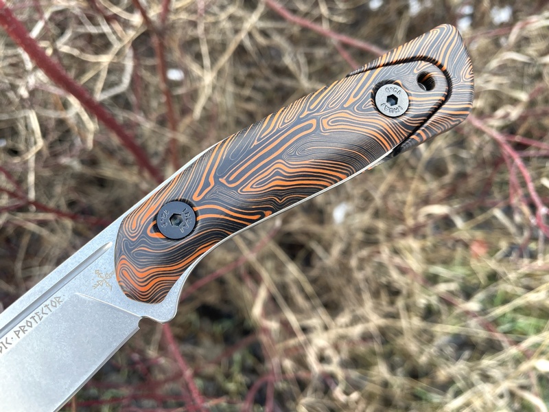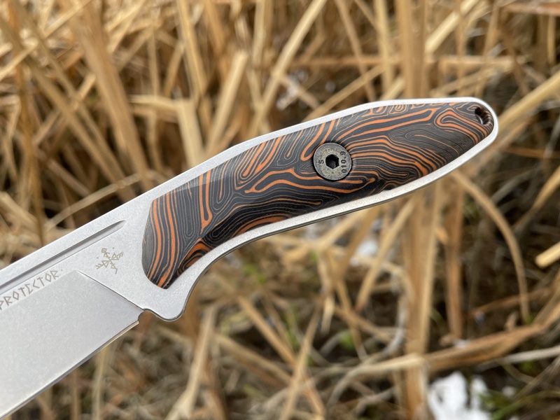 Next, the Knife can be fitting with either of Three different (supplied with the knife) scales. One fits with the edge of the tang exposed, the second set fits evenly with the tang and the Third extends the size of the handle.