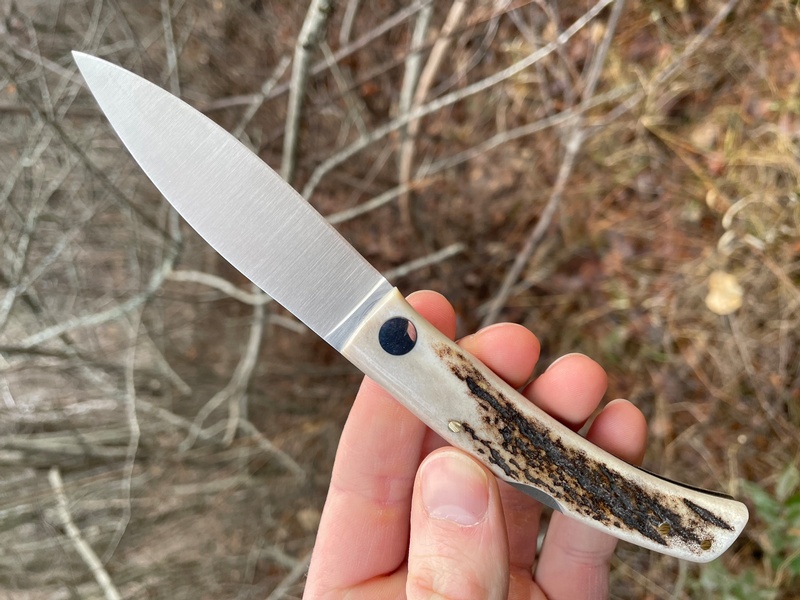 This blade is a simple lockback folder that sports a nice stag antler handle & steel pins. The blade profile is a simple spear point and the edge flat ground!