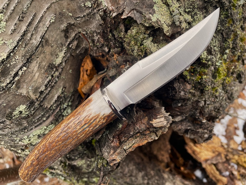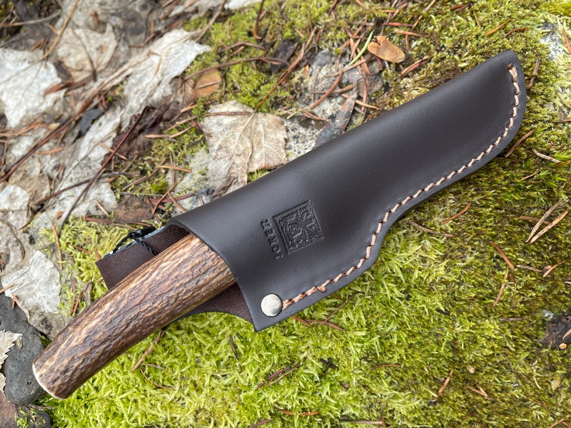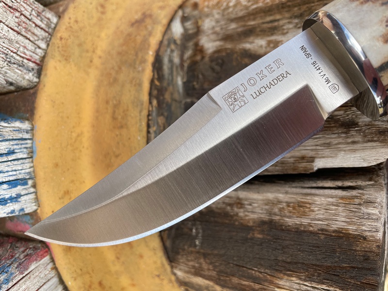 A very handy and compact little fixed blade by Joker knives of Spain! A stag antler handle in the Mova 1.4116 Stainless steel make this the perfect woods companion for your belt! It fits very nicely in the hand and has a sleek and functional feel!