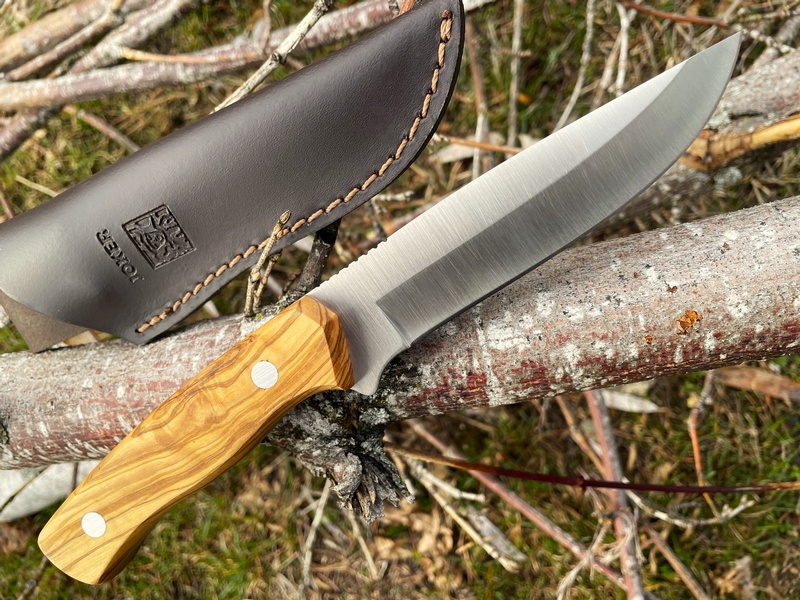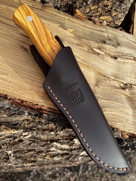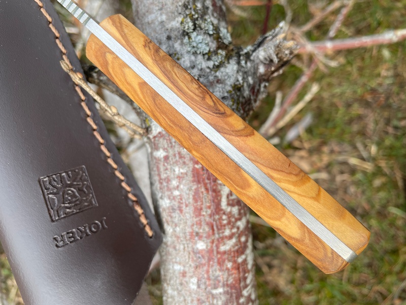 Full broad tang with solid Pins and a blade of the tough 420 stainless, the Aurri is robust and well balanced.The handle is a select piece of olivewood and the sheath a quality leather.
