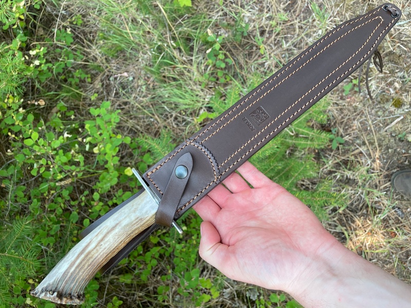 The knife is accompanied by a leather sheath in brown. The length of the handle is 6.2" and is made of stag horn.