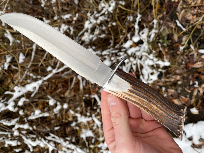 Quite an interesting design this one! Has a very comfortable stag handle with a meaty grip, so it fits in the palm very nicely. A Large Steel finger guard makes this knife very secure in the hand and easy to use.