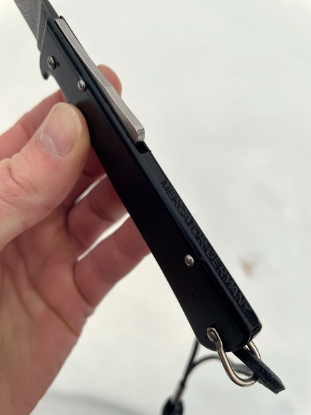The Mercator knife with the classic black steel case and Damascus has the same size as the classic, large Mercator and can also be locked. Included in the delivery is the leather strap with a steel eyelet. We use Damascus blades forged from low-alloy cold work steels (1.2842/1.5634, 75Ni8). The hardness is about 61 Rockwell. Please note that the Damascus we use is not stainless.