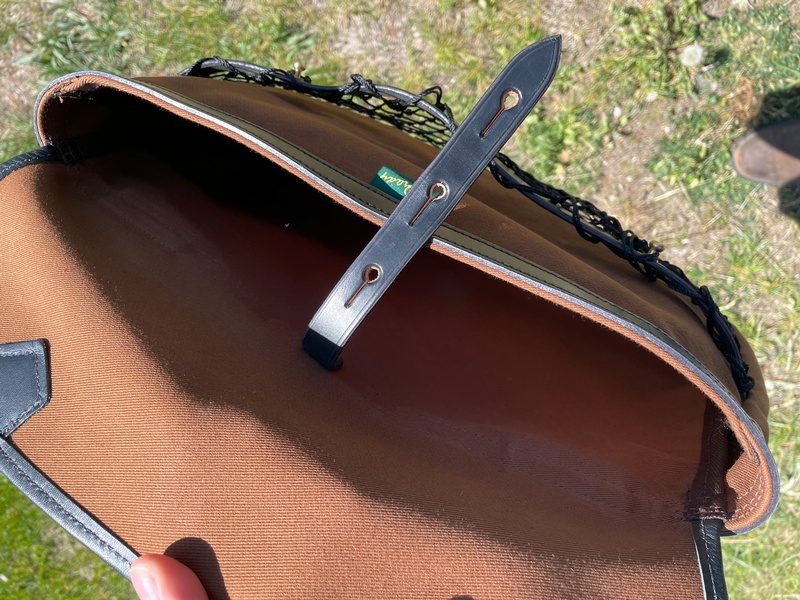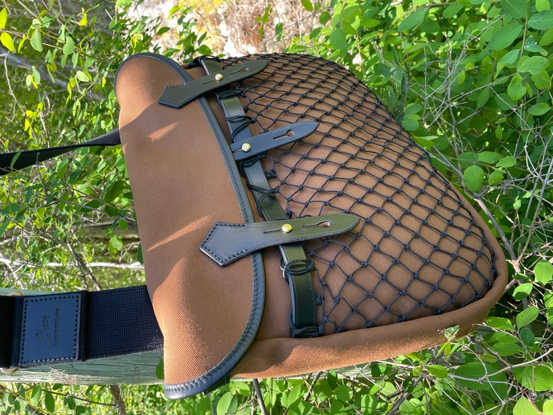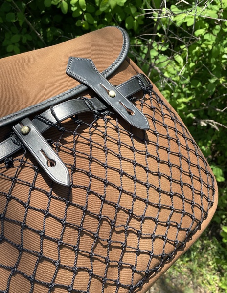 The leather-bound flap fastens with quick-release leather tabs and brass studs. A natural net game pocket runs across the front of the bag.