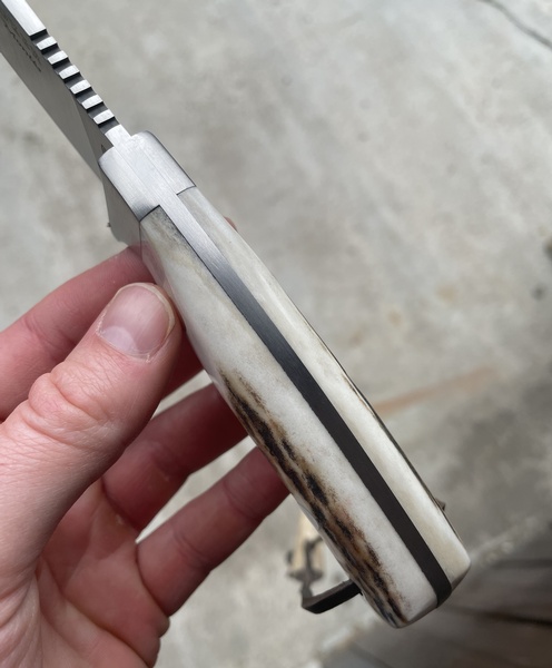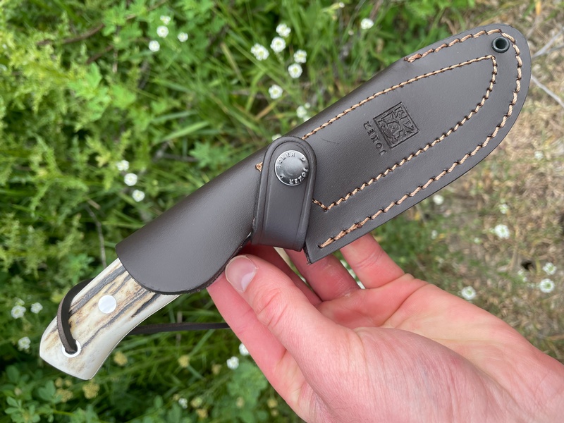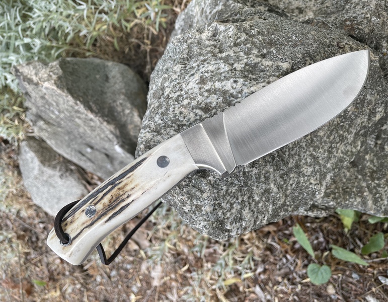 A little bit more blade length than the original but keeping the same excellent Blade shape and comfortable handle. Full broad tang with Stag antler slabs and a steel bolster! The blade is made of the time tested and very tough MOV 1.4116 Blade Steel.