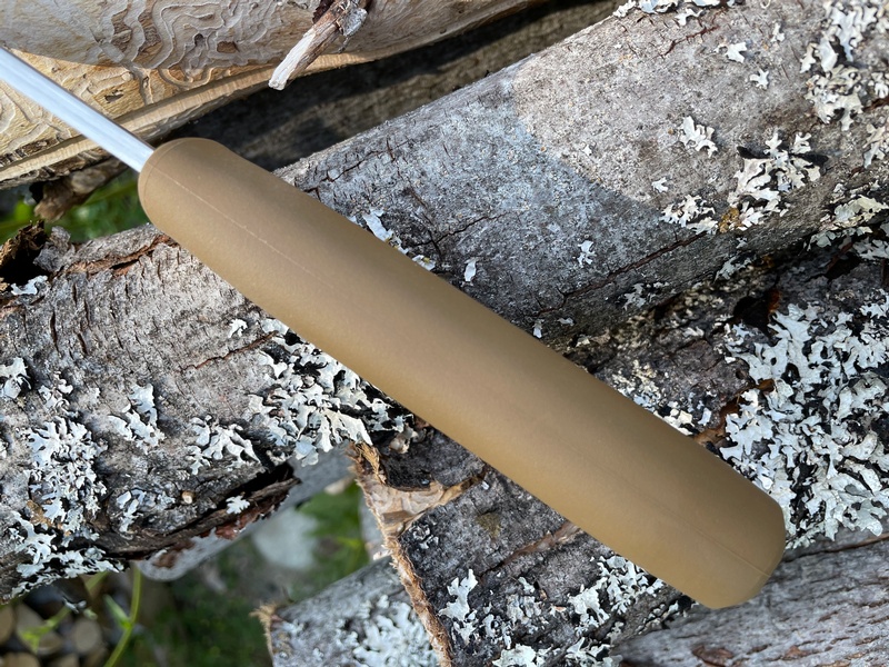 The Steel used is the exceptional Austrian N690 a full Stainless with stellar edge holding, high torsional Strength and excellent chip resistance thanks to its very high Colbalt content. A great choice for a Survival, or Bushcraft Blade Steel and compleaments the knife beautifully.