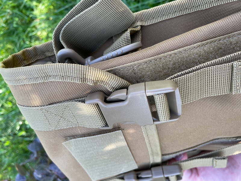 Double Buckle flap closure with hook and loop aswell, MOLLE on back. Comes with shoulder strap.