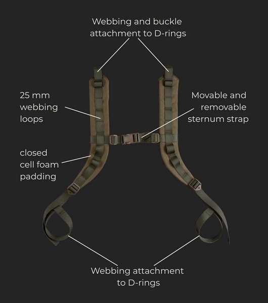 This is the complete shoulder strap assembly of the Kahakka backpacks, compatible with many of our and others packs and backs due to the simple yet universal webbing and buckle attachment system. Includes left and right shoulder strap, bottom straps and sternum strap.