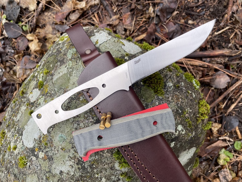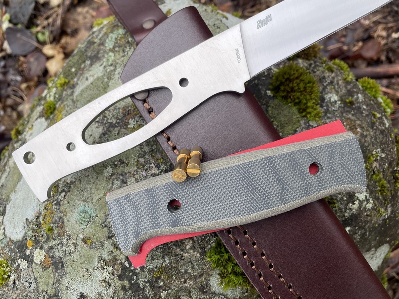 Brisa, made in Finland this is your chance to build a superb Camper Knife in N690. The Kit contains a Flat Ground Blade blank in the excellent N690 Colbolt Steel, Milled Green Micarta Scales, Red liners, Brass Rivets and a quality leather sheath.