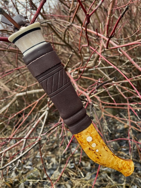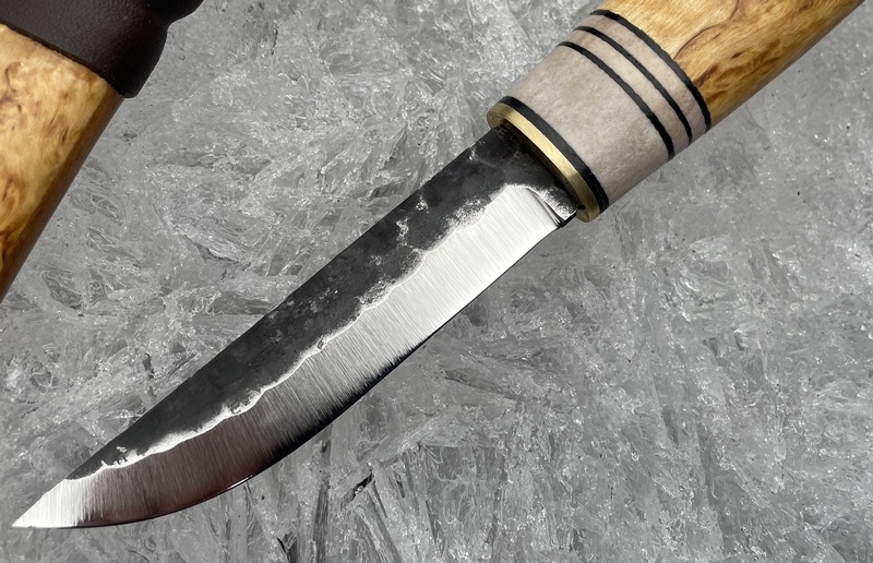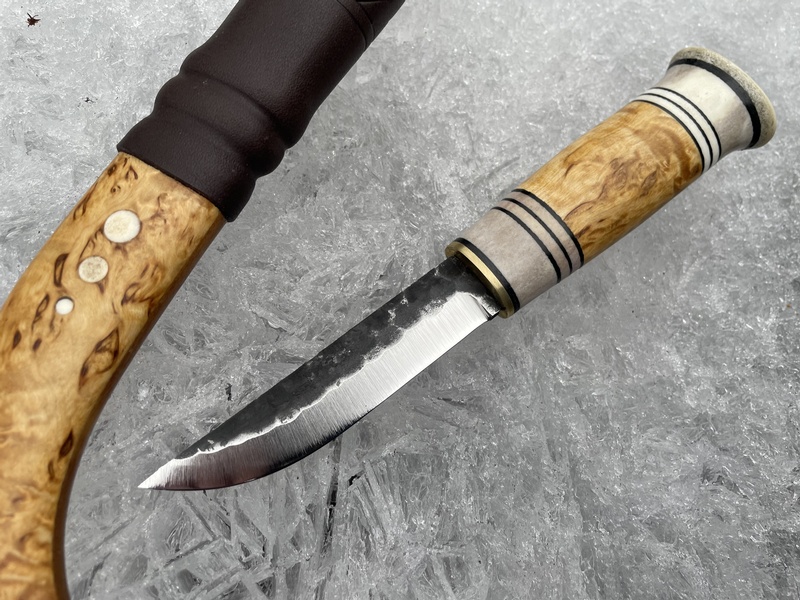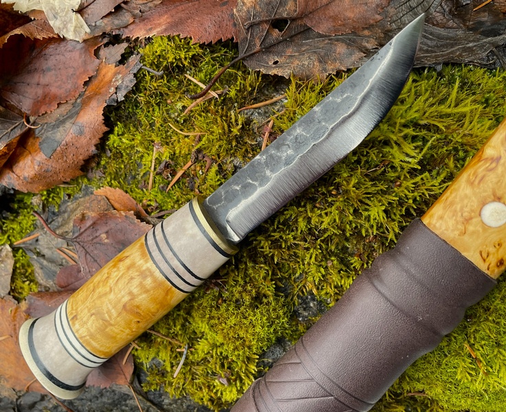 The Curly Birch and Antler makes for a comfortable handle, it also includes a sleek curly birch & leather sheath.