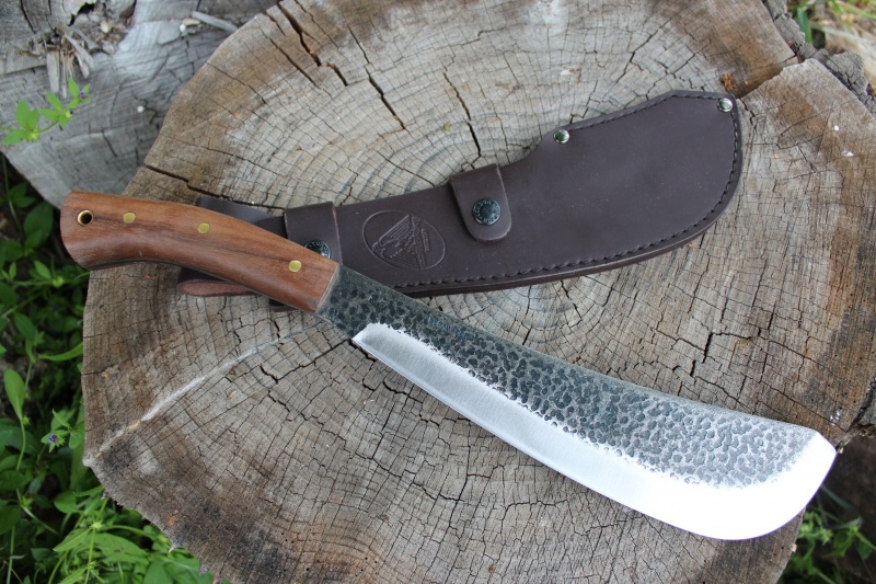 Hardwood handle, carbon steel blade to 57HRC, brass pins and brass lanyard hole. makes a great compact machete or even allaround camp knife/tool. Comes with quality leather sheath.
