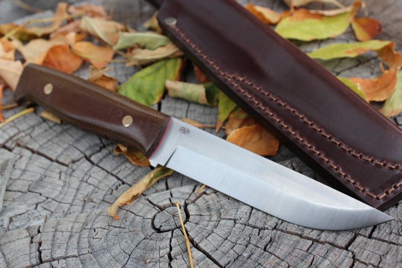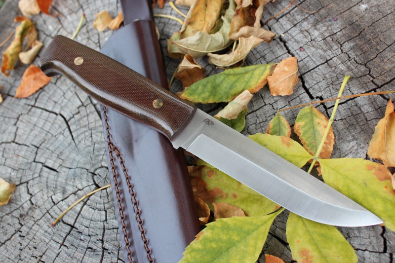 High quality, scadi grind outdoor knife, this one has Green micarta handles and D2 semi stainless steel to 61HRC. Excellent all around outdoor/bushcraft knife. Comes with leather dangler style sheath