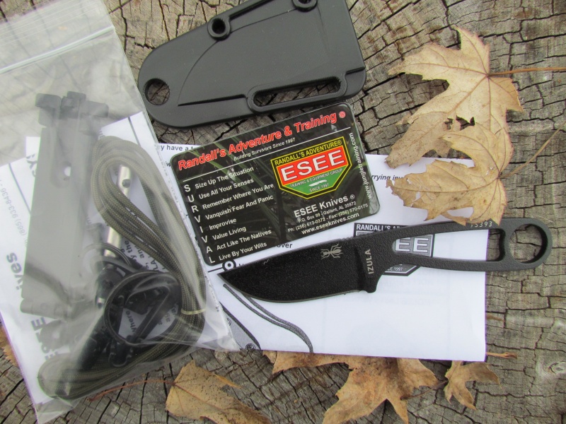 This is IZULA-B KIT, you get the great little IZULA knife, but with this kit you also get..paracord,whistle,cordlock,split rings,snap hook,fireflint,MOLLE lock and hardware, as well as the molded sheath. With this kit you can wrap the skeleton knife handle,hang/attach the knife in many different ways to your kit, start fires and whistle for rescue. A quality, well thought out kit based on the popular knife. ESEE knives were formally known as RAT Cutlery.