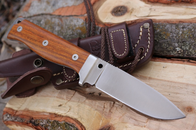 The removeable slabs are Cocobolo, the tang is extended to provide a lanyard hole, stainless bolsters as well make for a very sturdy outdoor knife.