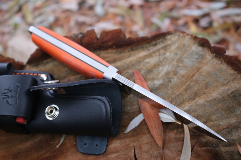 The removeable slabs are Orange G10 with Black liners, the tang is extended to provide a lanyard hole, stainless bolsters as well make for a very sturdy outdoor knife.