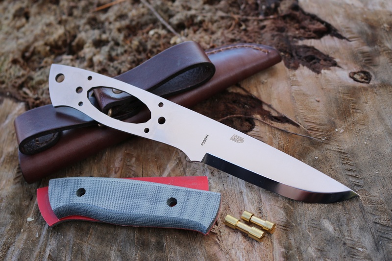 Everything you need to make up this exceptional Bushcraft knife, the full broad tang blade blank (N690 steel, scandi ground, 59HRC), two precut Black Micarta slabs with Red liners, x2 brass corby rivets to secure the slabs and the sheath as well.