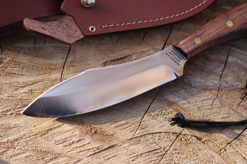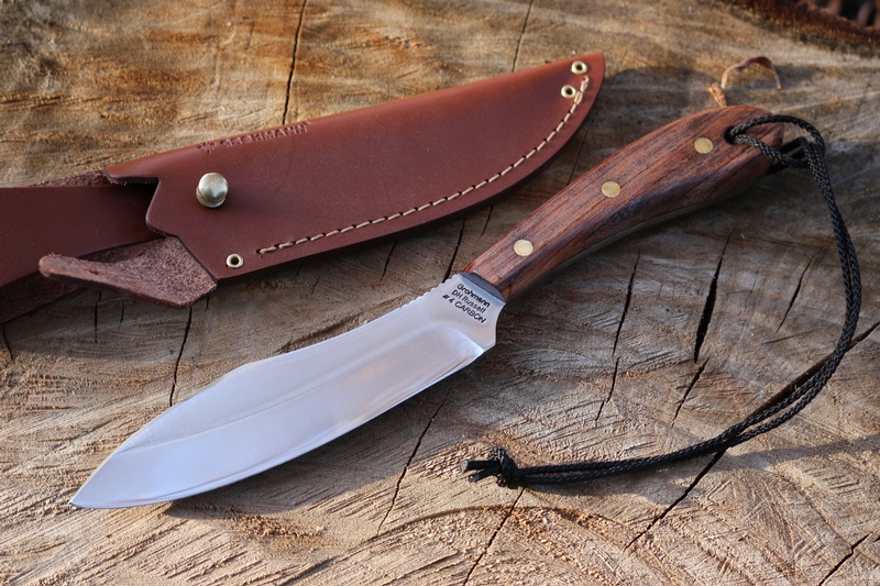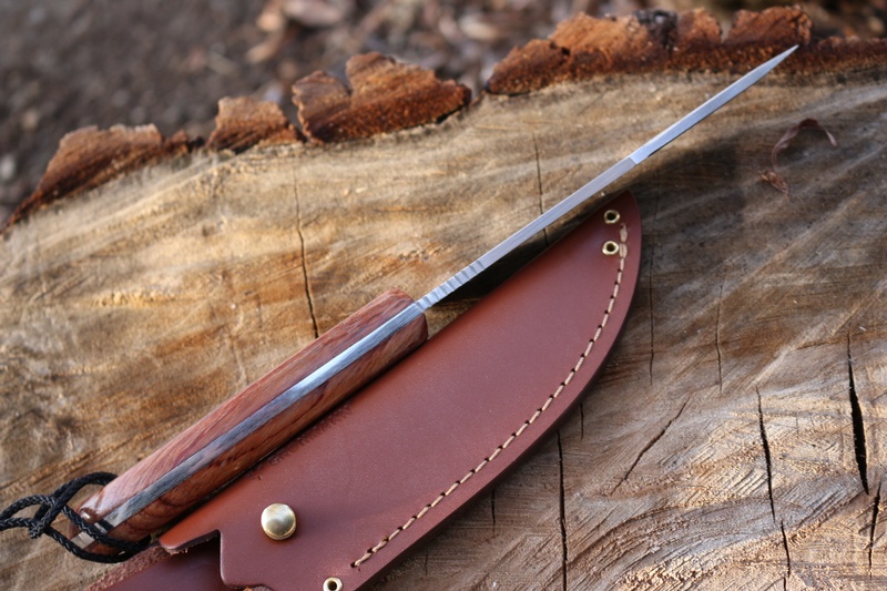 Full broad tang with soild pins and Rosewood slabs, the 3.75mm thick blade is of German C70 High Carbon Steel, 58HRC. The robust spine is jimped and the blade is an upswept drop point.