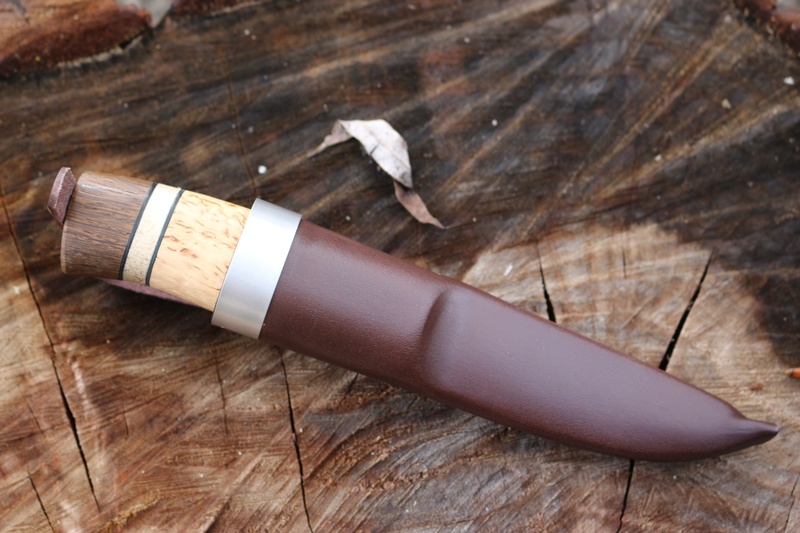 The handle is a deep bellied Oak, Stag with Curly Birch with a stick tang and a brass ferrule. The knife is a quality piece of kit, a great camp knife and hiking companion.
