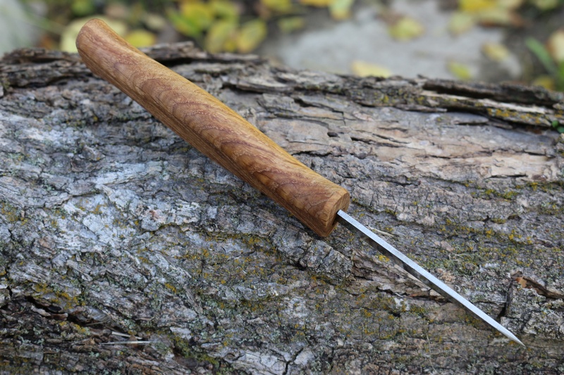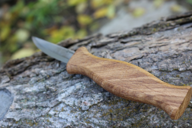 The Handle is Oak and the blade a High Carbon scandi ground.