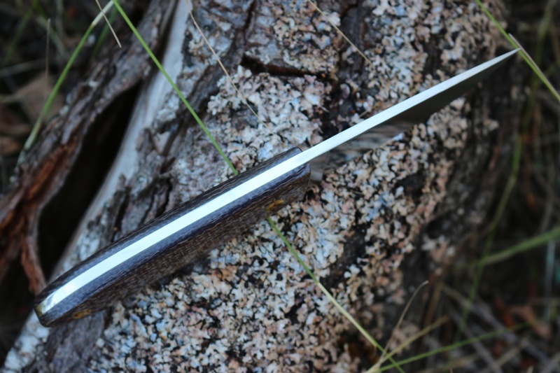 Full broad tang, 3.2mm thick, solid slabs this compact knife is tough and strong. The blade is a great all around cutter with a Flat grind and taper point, this handy little knife would make for a great Carving, Camp, EDC or hiking companion.