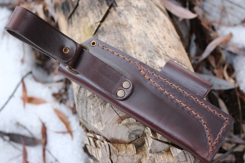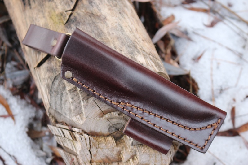 Squared scandi style leather sheath. Full grain brown leather with belt loop and extended belt loop so sheath can be worn high or low, has firesteel loop.