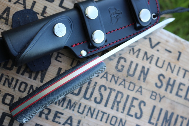 The knife has solid Micarta slabs with Red Liners and the ergonomic handle is comfortable and great for different hand postions. The Blade is a classic upswept drop point with choil and tapered tip.