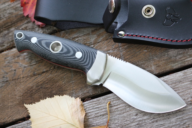 The handle is ergonomic with wide micarta slabs and solid pins and accomodates a lanyard hole and solid finger guard. The blade is a bellied drop point, great for a variety of applications.