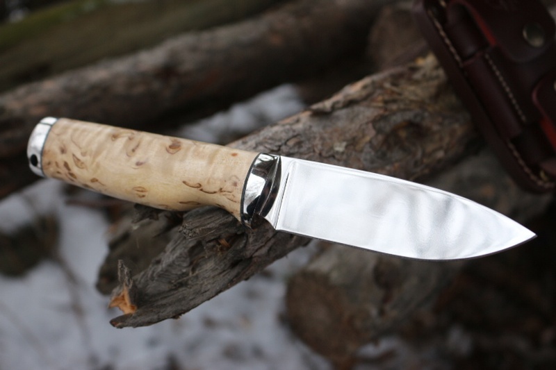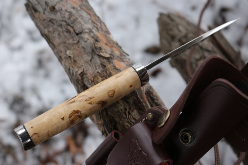 Beautiful Bushcraft knife from Cudeman of Spain, made in the traditional manner of a Hidden Tang handle ( Made from locally Sourced Curly Birch) this knive has a lot of hand work in production and the handle is both beautiful and ergonomic.