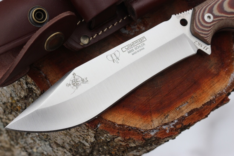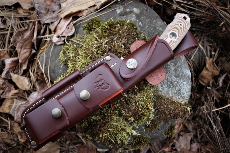 The extra 6 uses the same blade shape and excellent Bohler N695 steel of the original knives, but with an upgraded full grain leather sheath which allows for firesteel carry and sharpener carry too. (Sheath and Sharpener included).