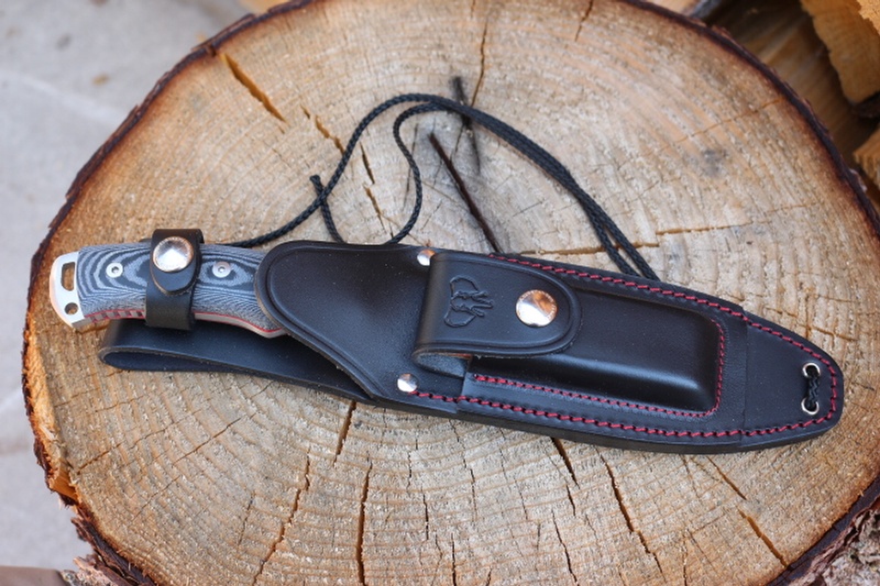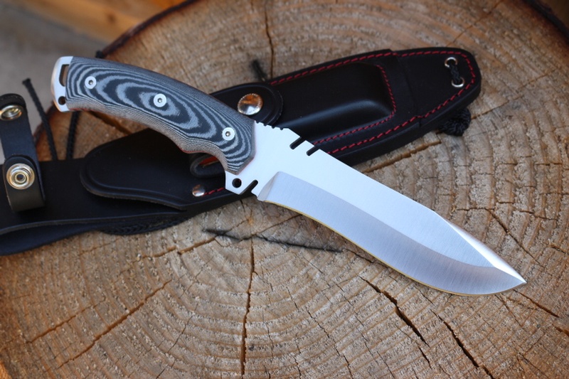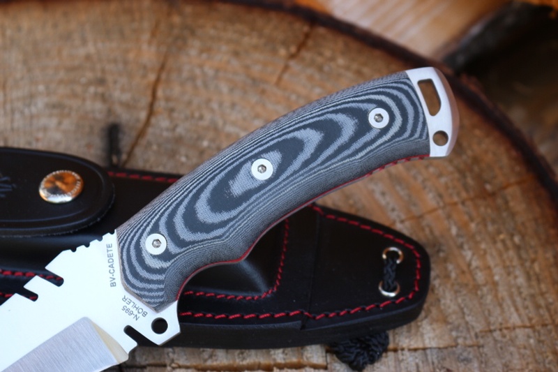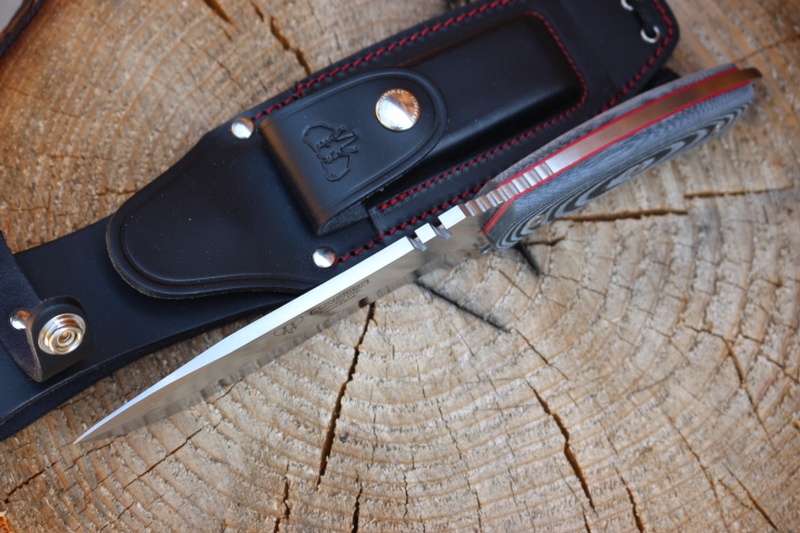The Full broad tang (with Ext Tang and double lanyard holes) the knife is strong and well made. It has sculptured handle with Solid Micarta (removeable) Slabs and Red liners and jimping on the Thumb ramp and underside.