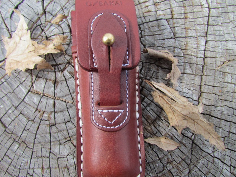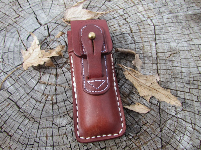 High quality leather pouch for folders and similar tools. Folder over design with a bead lock. High quality leather and stitching, very nicely put together.