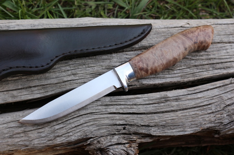 The Maple Burl handle has a deep swell for comfort and traction and the Blade sits alert from the Aluminium bolster, ready for use!