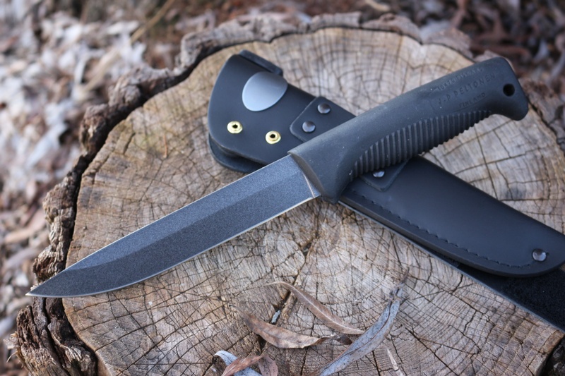 Rather rare this, and I only have x2. Highly practical and robust outdoor knife,comfortable rubberised handle, with finger guard , textured for grip and good gloved grip too. Flat grind, 5mm thick blade of high carbon steel gives strength and edge holding. Sheath is robust.