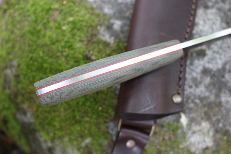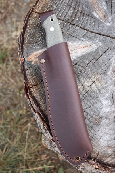 The knife utilizes the Trapper handle for comfort, full broad tang and solid pins for strength (4mm stock, spine is square) and has that superb upswept blade thats allows for so many applications in the Outdoors. Feild dressing, woodwork, food prep, fire prep and many more