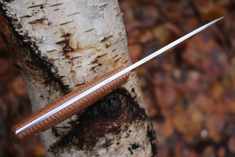 The Blade is Flat Ground with a Capped 3.4mm Spine, tapered tip and rounded off choil.