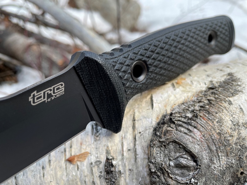 Its has a very high end DLC coating for extra protection, the full broad tang accomodates the Black micarta slabs and Solid Butt Cap with Large Hollow Pins.