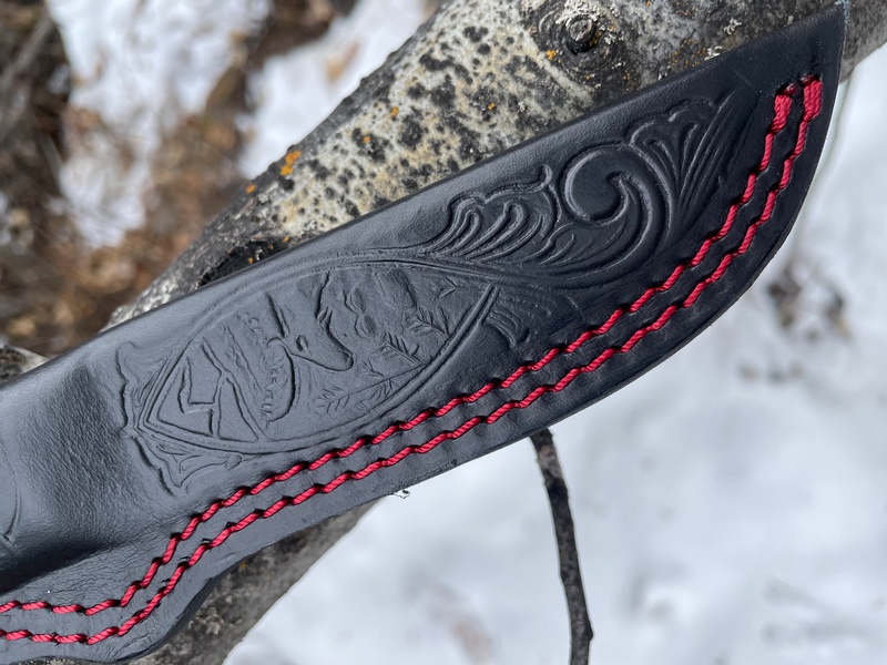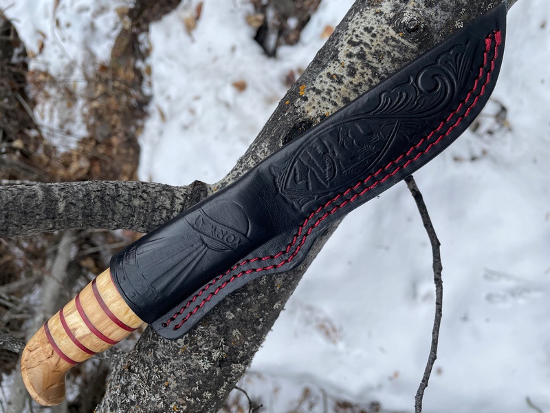 Jan Steffen’s design features a 110 mm long and highly polished H3LS blade with a slight false edge/swedge on the spine. The 107 mm handle features stacked red leather inlets and curly birch in combination. The sheath, made with the original 1930s style Helle print on it, is done in black with red stitching to honor the forge that Jan Steffen’s grandfather was in charge of running.