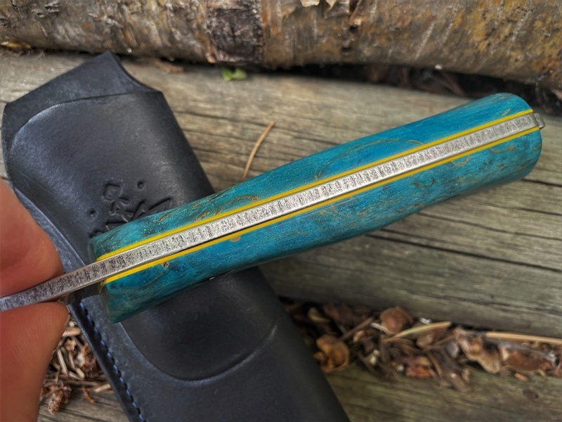 A Modern take on a classic Viking and Anglo Saxon knife, Made from the excellent Swedish Sleipner steel. This particular model is the full broad tang version with a Stabilized Curly Birch Handle in Blue & steel pins. An excellent choice if you're looking for something as functional and tough as a modern knife, but with that old world design & look.