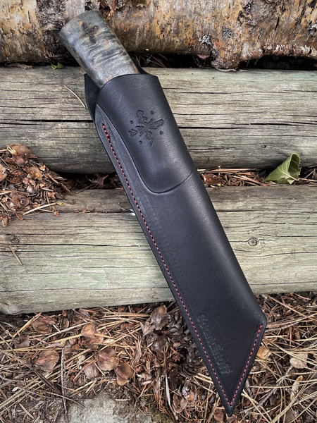 The blade profile has the the classic "Seax" clip point and a stone washed finish, and some inscribed runes on each side of the blade. Sleipner Steel is a great Steel for an outdoor knife, being a High Carbon Tool Steel that has strength and a fine edge, but it also has a good deal of Chromium to resist corrosion. The knife also comes with a high quality leather sheath made with a thick leather that has excellent stitching.