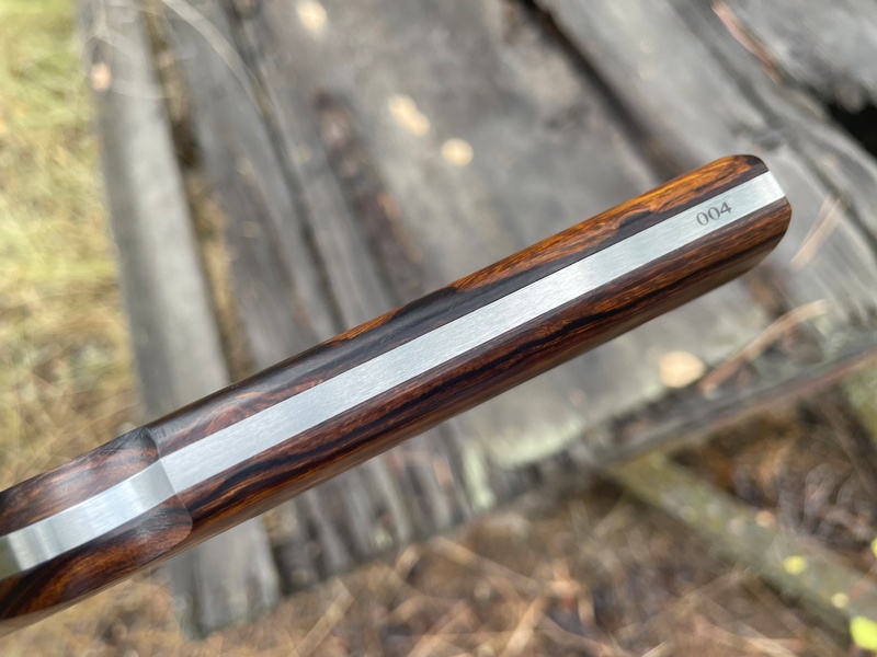 The Steel is in ELMAX and at 4.5mm thick with a Full Broad Tang this is a true Bushcraft capable blade! Scandi ground of course and sports a Beautiful Desert Ironwood handle! All the knives are individually numbered.